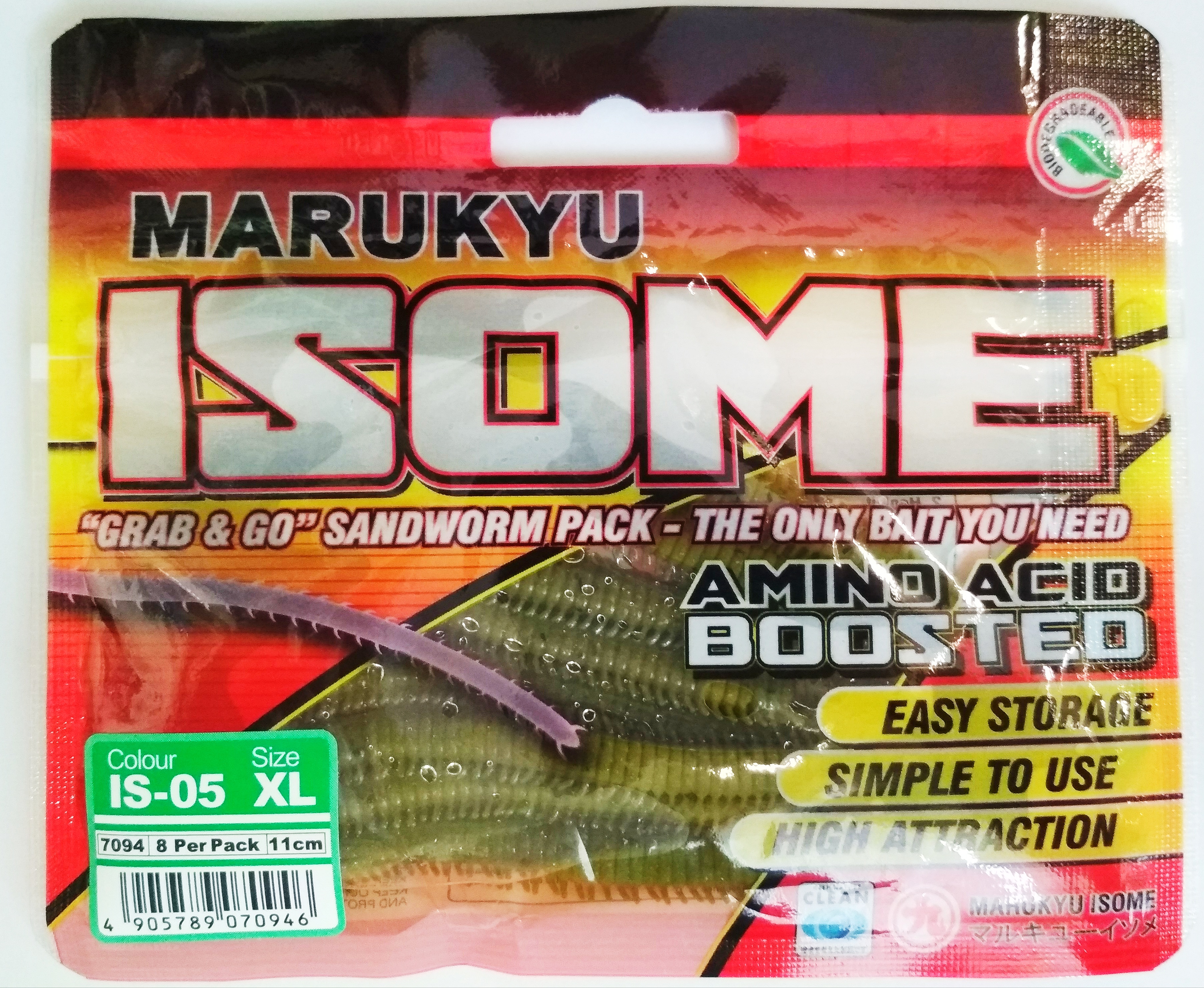 Marukyu POWER ISOME - имитация нереиса (песчаного червя) из биоразлагаемого материала с добавлением аминокислот и аттрактантов. При этом материал хорошо и долго держится на крючке, выглядит и ощущается как реальная, живая приманка. Удобная упаковка с замком позволяет сохранить приманку для многоразового использования. Power Isome хранятся при комнатной температуре, что является большим преимуществом по сравнению с натуральными червями. Может использоваться для ловли самых разнообразных рыб, в том числе мирных.